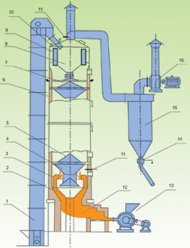 1、提升機 2、下料漏鬥 3、導熱管 4、滑料盆 5、散料錐 6、耐熱保溫層 7、截流裝置 8、料倉 9、預熱管道 10、智能料粒儀 11、預熱儀 12、熱風爐 13、噴煤機 14、料閥 15、收塵器 16、風機。